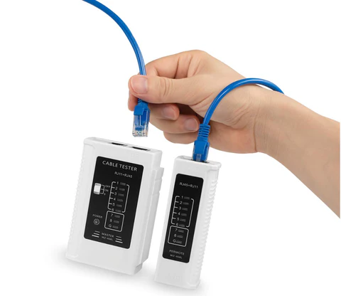 Test kabelen med en kabeltester for å være sikker på at alle ledningene er riktig koblet og at den funker som den skal. Testeren viser om forbindelsen er riktig på alle åtte pinnene.