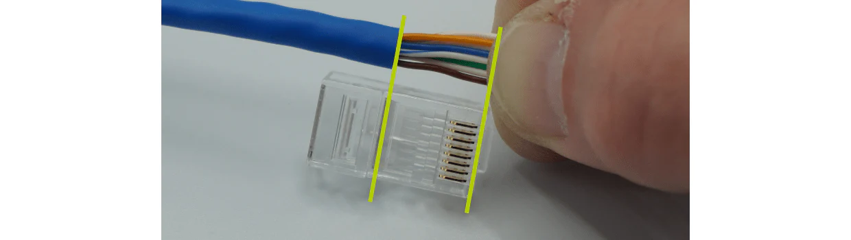 Ta ut RJ45-kontakten og skyv forsiktig ledningene inn uten å blande fargerekkefølgen med låsefliken pekt ned. Pass på at hver ledning går helt i sin plass og at ytterkappen(tuppen av ytterkappen) går litt inn i kontakten for å støtte altså holde den bedre på plass.