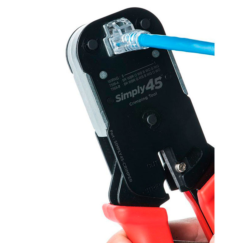 Sett RJ45-kontakten inn i en krympetang og press den sammen til du kjenner ett click som betyr at pinnene har låst seg fast i lederne dette fester både ledningene og ytterkappen.